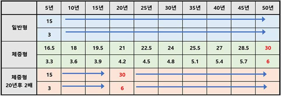 - 10%체증형 : 최초 15만원에서 5년마다 10%씩 할증