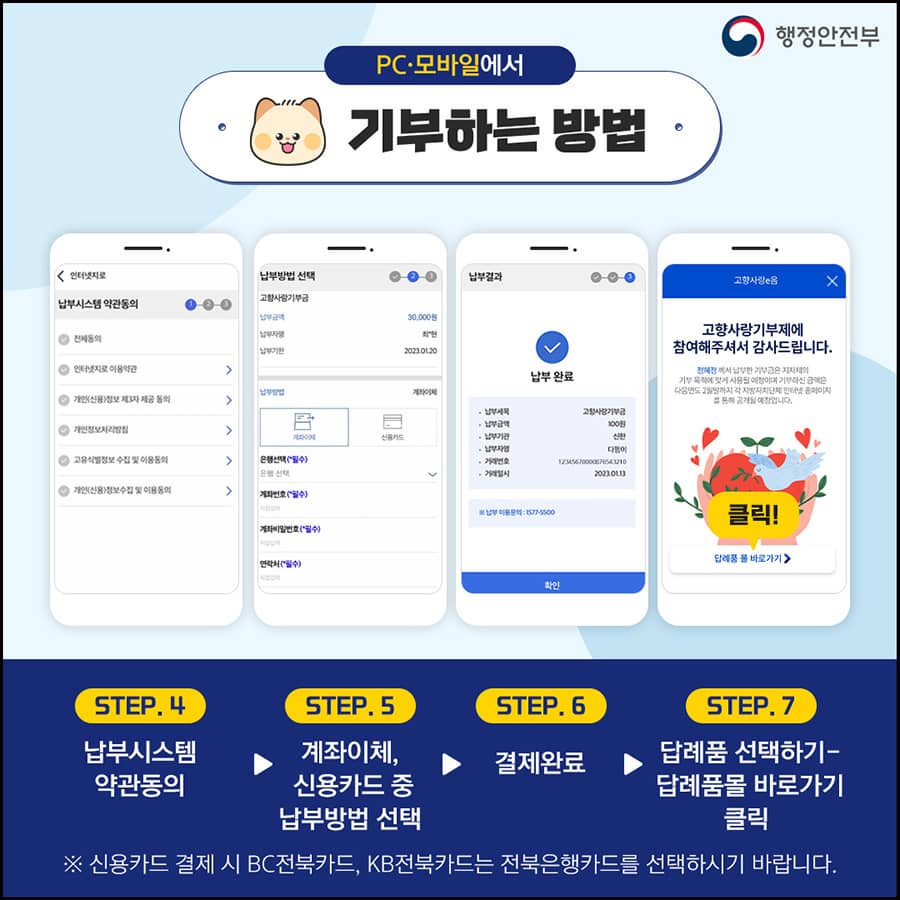 기부하기에는 자치단체 기부와 특정사업에 기부 두가지 방식이 있습니다. 두가지 방식중 선택을 하시면 됩니다.