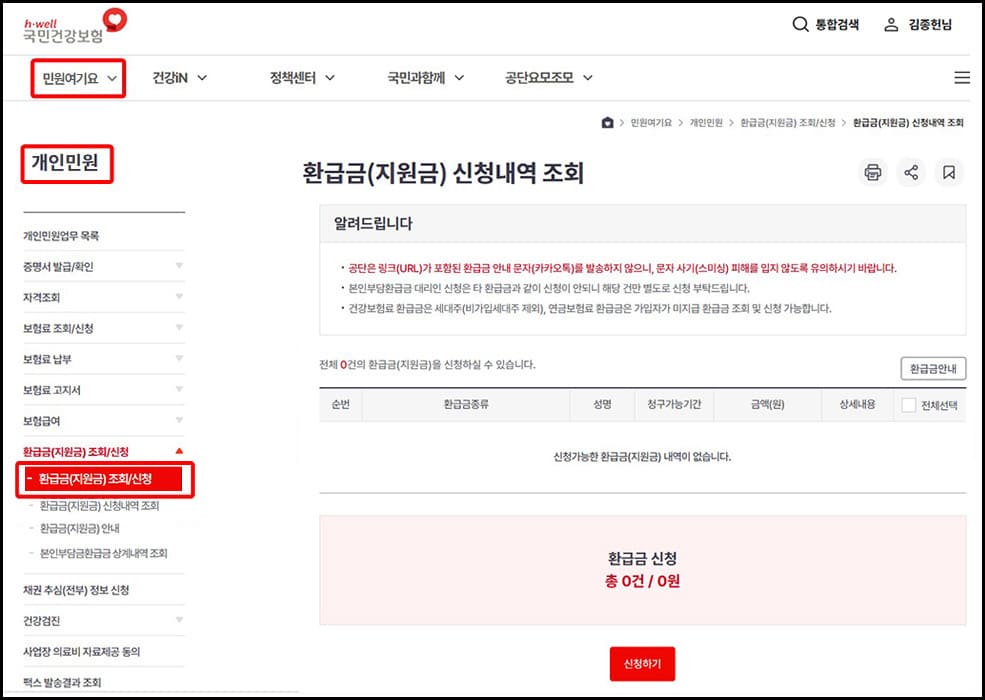- 국민건강공단홈페이지 환급금조회/신청 > 상단 메뉴 [민원요기요] > [개인민원] > [환급금(지원금)조회/신청] > [환급금(지원금)조회/신청] 클릭