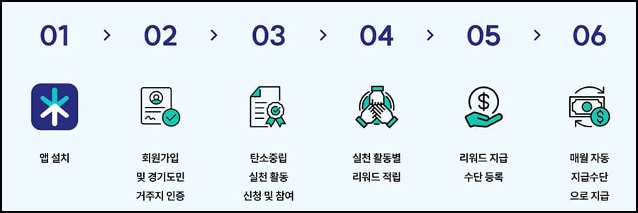 경기도민이 일상생활에서 탄소배출을 줄이기 위해 다양한 활동을 실천하고, 이를 전용 앱을 통해 인증하면 지역화폐로 보상을 받을 수 있습니다.