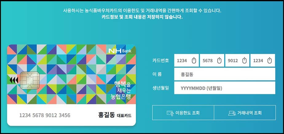 - 농식품바우처 홈페이지에서 카드번호를 및 관련정보를 입력 하면 거래내역 및 잔액 조회가 가능합니다.