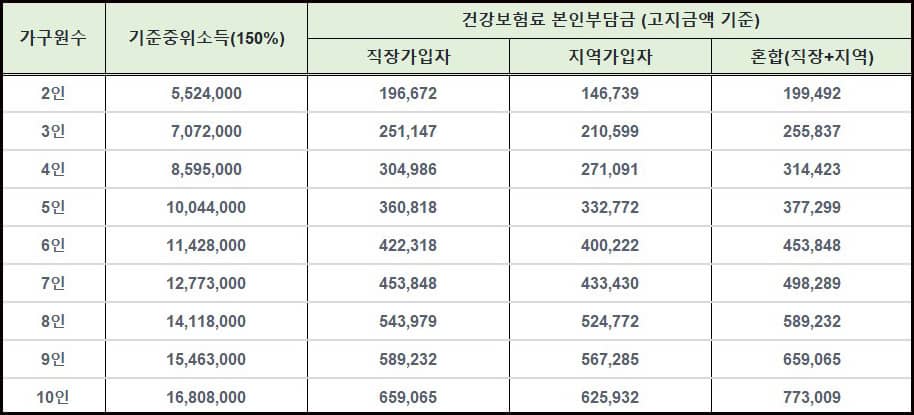 [건강보험료 본인부담금에 의한 기준중위소득 150% 판정기준]