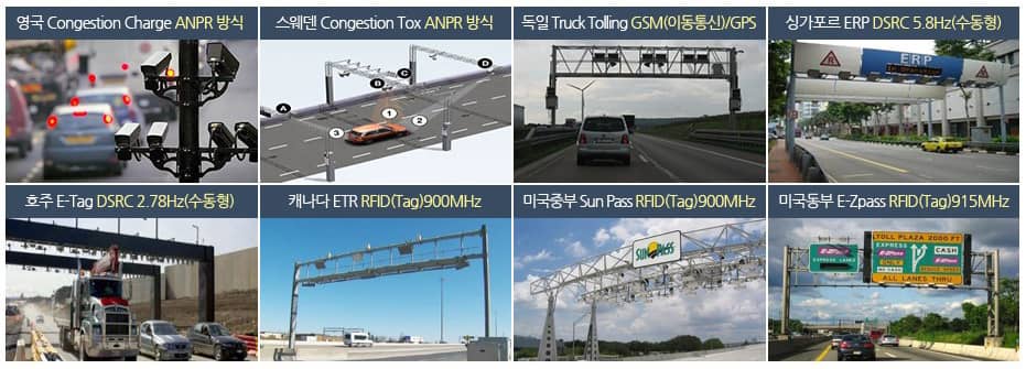 - 이처럼 해외 주요국에서도 다차로 요금징수는 태그(RFID, 수동 RF), 영상기반(ANPR), DSRC(능동RF), 이동통신(GSM+GPS) 기술을 적용해 스마트톨링 시스템을 도입하여 운영 중입니다.
