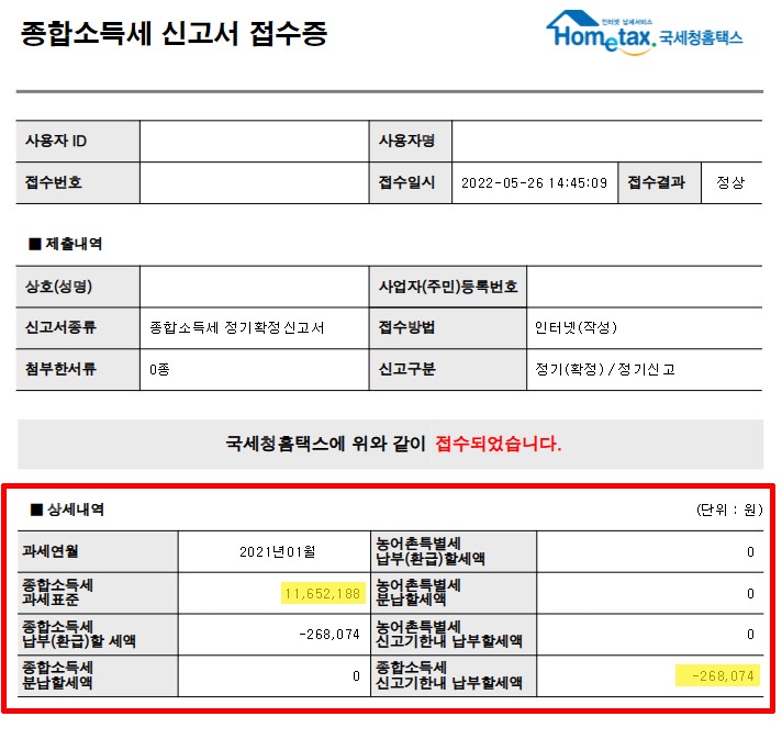 [홈택스 최종 신고후 *신고서 접수증에 금액이 마이너스(-) 일 경우 환급이 됩니다.]