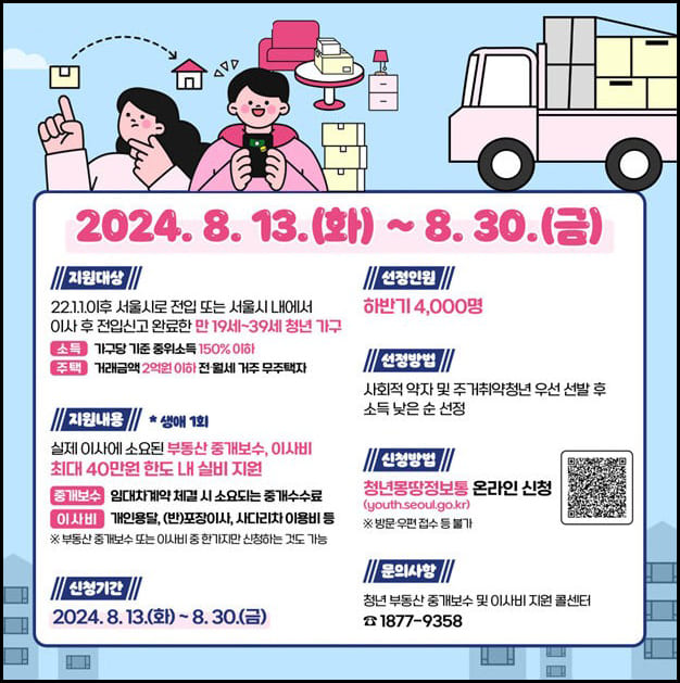 서울시는 일자리와 학업 등으로 자주 이사하는 청년 가구의 주거비 부담을 줄이기 위해 2024년부터 청년 부동산 중개보수와 이사비 지원사업을 시행합니다.